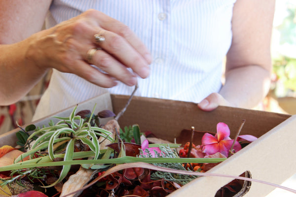 Every creation begins with a quiet walk in nature. Shirley gently collects what the earth has offered fallen petals, leaves, roots and flowers. Each piece grows from what nature gives, telling the story of its origin: the forest, the field, the soil itself.