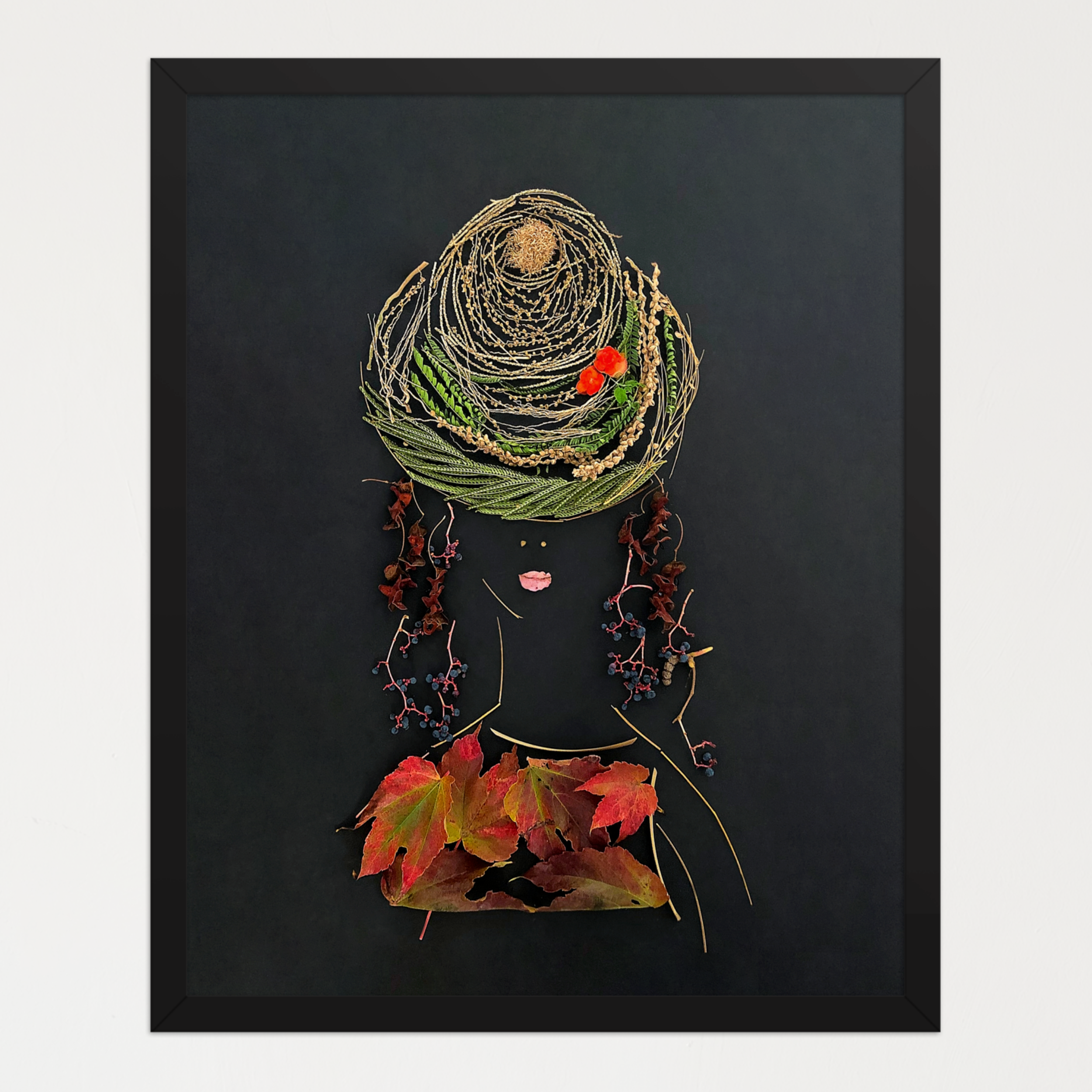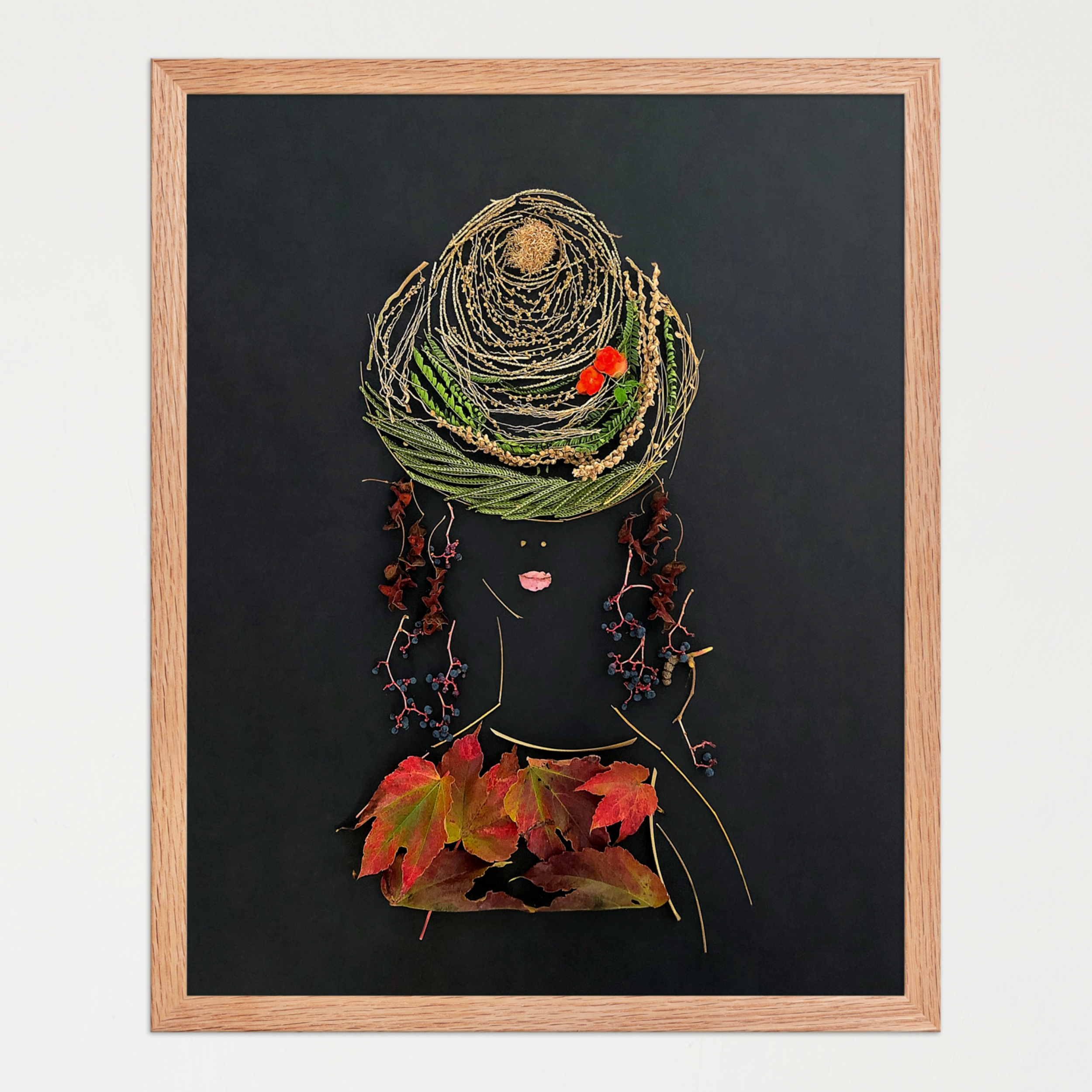 The composition feels grounded and reflective, blending warm seasonal tones with delicate natural details. Layered foliage forms the clothing, while subtle botanical accents shape the face and adornment, creating a portrait that feels both timeless and deeply connected to the rhythms of nature. The result is an artwork that brings calm presence and seasonal warmth into the home without feeling decorative or fleeting.