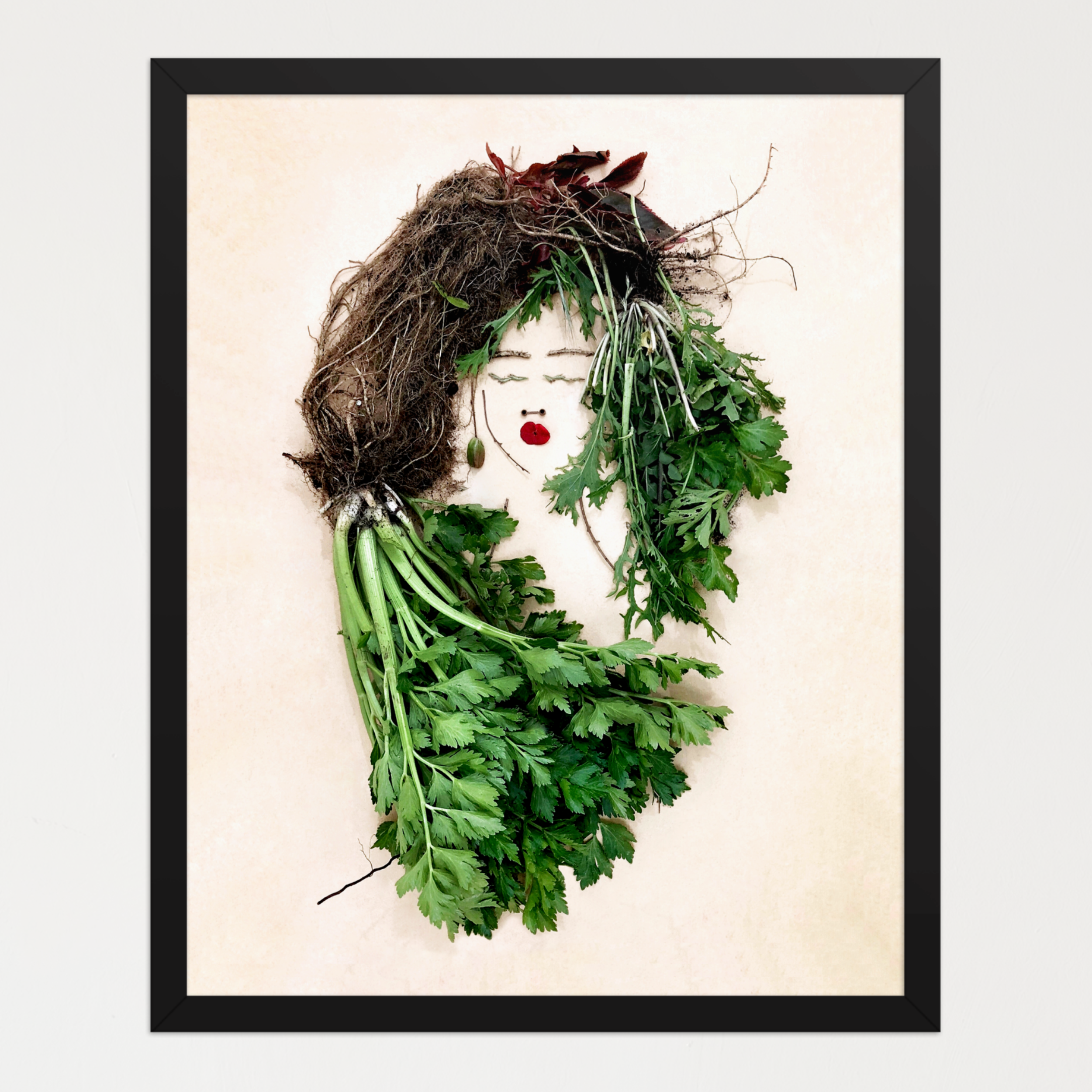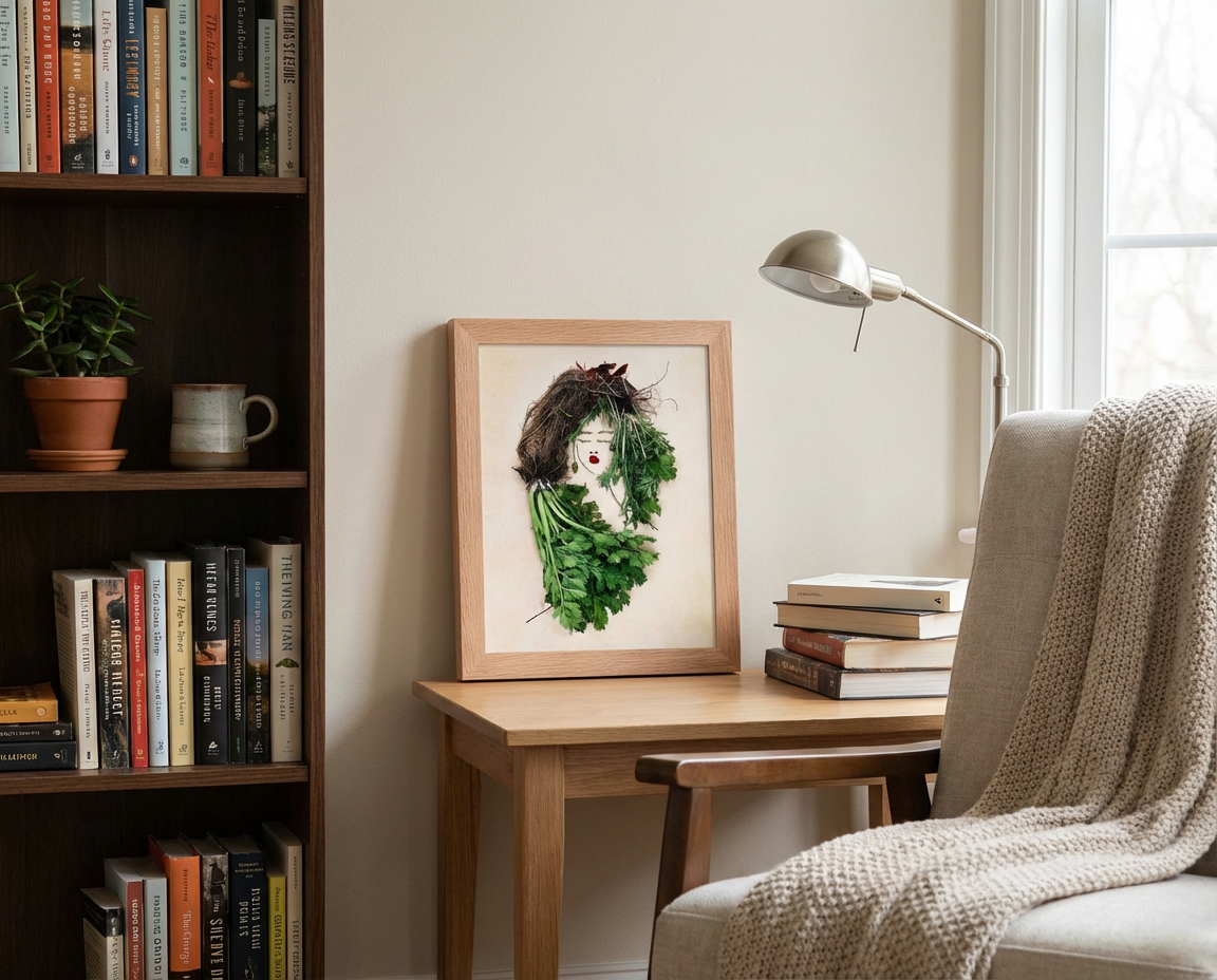 Elevate your space with The Celery Woman, a botanical feminine wall art piece that bridges nature and quiet introspection. This vertical floral portrait uses verdant celery stems and leaves to shape an elegant figure, creating a soothing focal point that invites thoughtful reflection.
