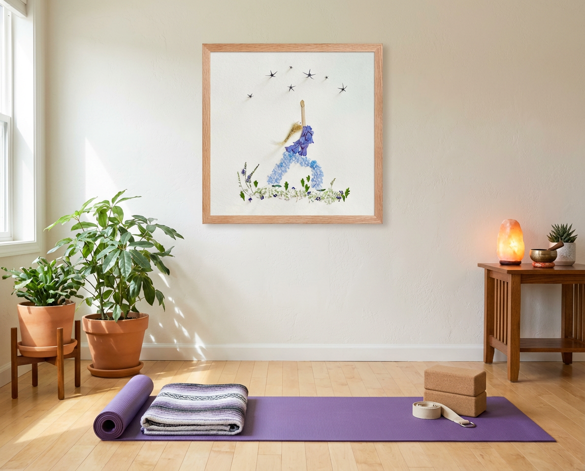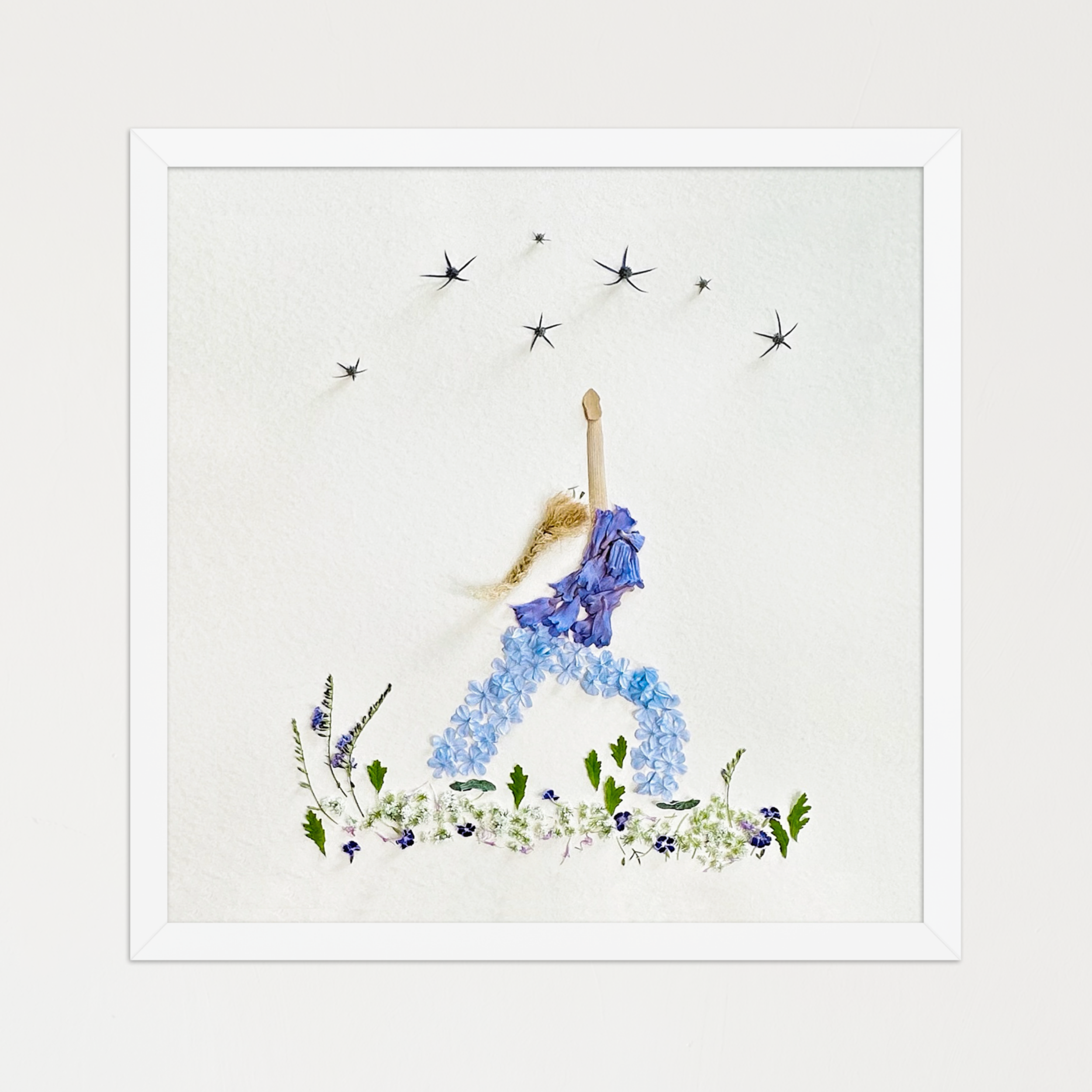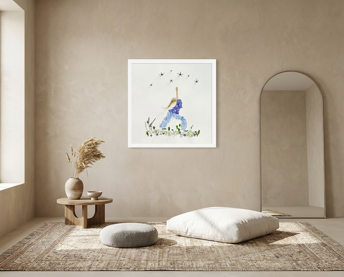 Invite quiet balance into your space with Blue Petal Balance, a square botanical feminine wall art piece that feels like a still moment suspended in gentle motion. Soft blue blossoms and delicate wildflower stems form a poised figure that evokes harmony and mindful presence. The simplicity of this natural composition brings a serene focal point, perfect for spaces where rest and reflection are welcomed.